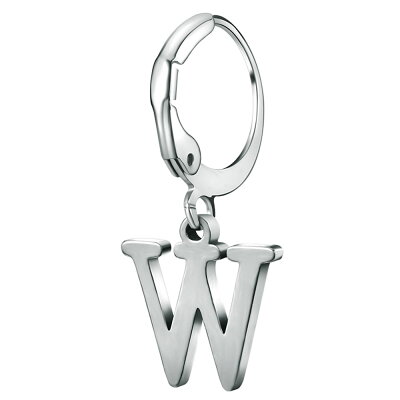 細身のレバーバックタイプのリングピアスに英語のアルファベットのW(ダブリュー)のチャームが揺れるステンレスピアス。